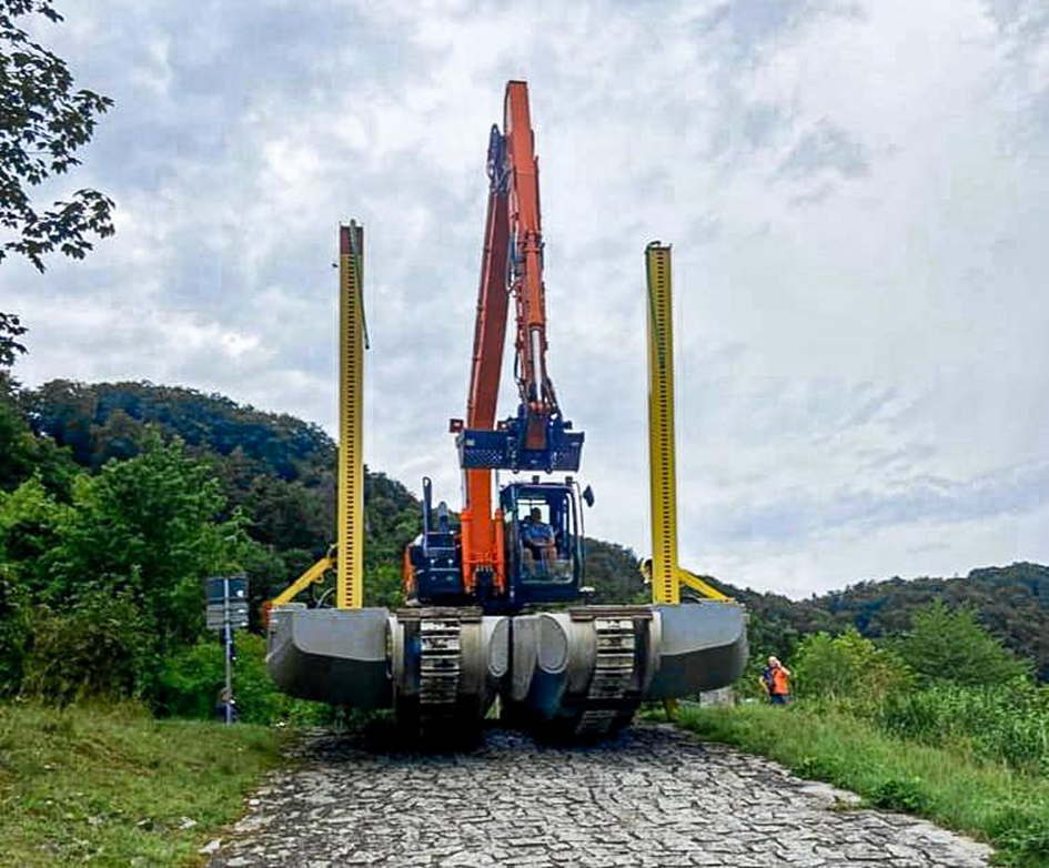 Pour répondre à cette problématique, la pelle amphibie a été développée. Les chenilles classiques ont été remplacées par des pontons hermétiques qui assurent la flottabilité et la stabilité de la machine. Grâce à ce système, la pression exercée sur le sol est fortement réduite, permettant à la pelle de se déplacer directement dans les zones humides, marécageuses ou inondées, sans nécessiter d’infrastructures ou d’équipements supplémentaires.