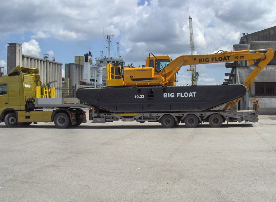Le transport d’une pelle amphibie est particulièrement simple : une remorque porte-engins standard suffit. La BIG FLOAT est dotée d’un châssis hydraulique rétractable, permettant de passer aisément du mode travail — à largeur maximale — au mode transport, où la largeur est réduite au minimum afin de respecter les gabarits routiers en vigueur dans chaque pays.